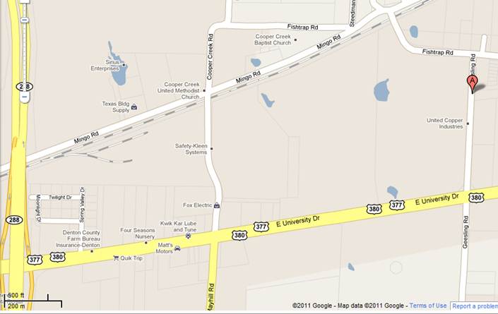 1 mile east of Highway 288, and 1 block north of Highway 380 in Denton on Geesling Road, across the street from the United Copper Industries, behind the